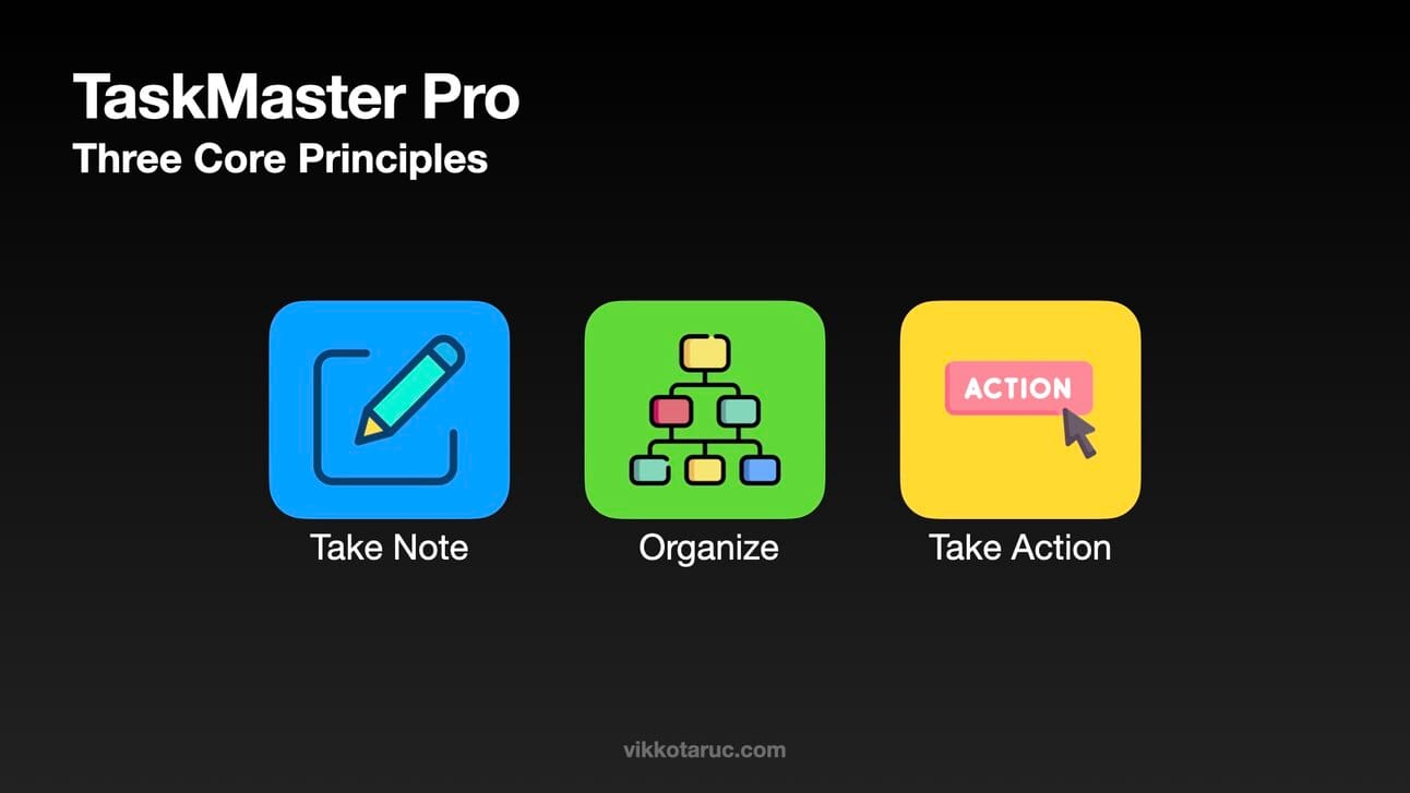 At the heart of TaskMaster Pro are three core principles that guide every aspect of the system: Take Note, Organize, and Take Action.